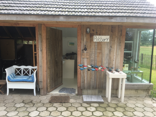 In mijn kapschuur heb ik de pottery ingericht, dit is mijn werkplaats en tevens een expositieruimte. Deze is opengesteld voor bezoekers op de momenten dat ik aanwezig ben. Een bordje aan de weg geeft aan waar het is zodat belangstellenden de pottery kunnen bezoeken.