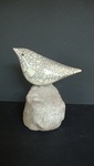 2019Raku gestookte wit geglazuurde gestileerde vogelvorm opeen natuurstenen voet