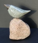 2014Discusvormige wit - craquelé raku gestookte gestileerde vogelvorm op een pen en een natuurstenen voet.