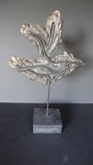 2011Gestileerde vogelvorm op metalen pen en stenen ( zwart gepolijst betonnen-) voet. Materiaal: witbakkend aardewerk, pitfire (open vuur) gestookt in combinatie met metaal. Door het stoken in een open vuur ontstaat een grillig spel van zwart en grijstinten. Het metaal vormt een lineair lijnenspel met het keramiek.