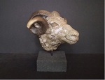 2011Ramskop op een metalen pen en een stenen (zwart gepolijste betonnen) voet. Materiaal: witbakkend aardewerk met koperhoudend glazuur, raku gestookt, door de reducerende atmosfeer is het koper tijdens het bakproces uitgetreden en als een dun laagje op het glazuur neergeslagen, de ongeglazuurde klei (o.a. de horens) zijn door het rookproces zwart gekleurd. Als onderwerp is een Ouessant ram gekozen.