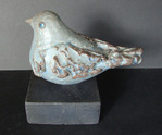2011Gestyleerde vogelvorm op stenen (zwart gepolijst betonnen) voet. Materiaal: zwartbakkend aardewerk, engobe en effectglazuur, oxyderend gestookt op 1100 graden.